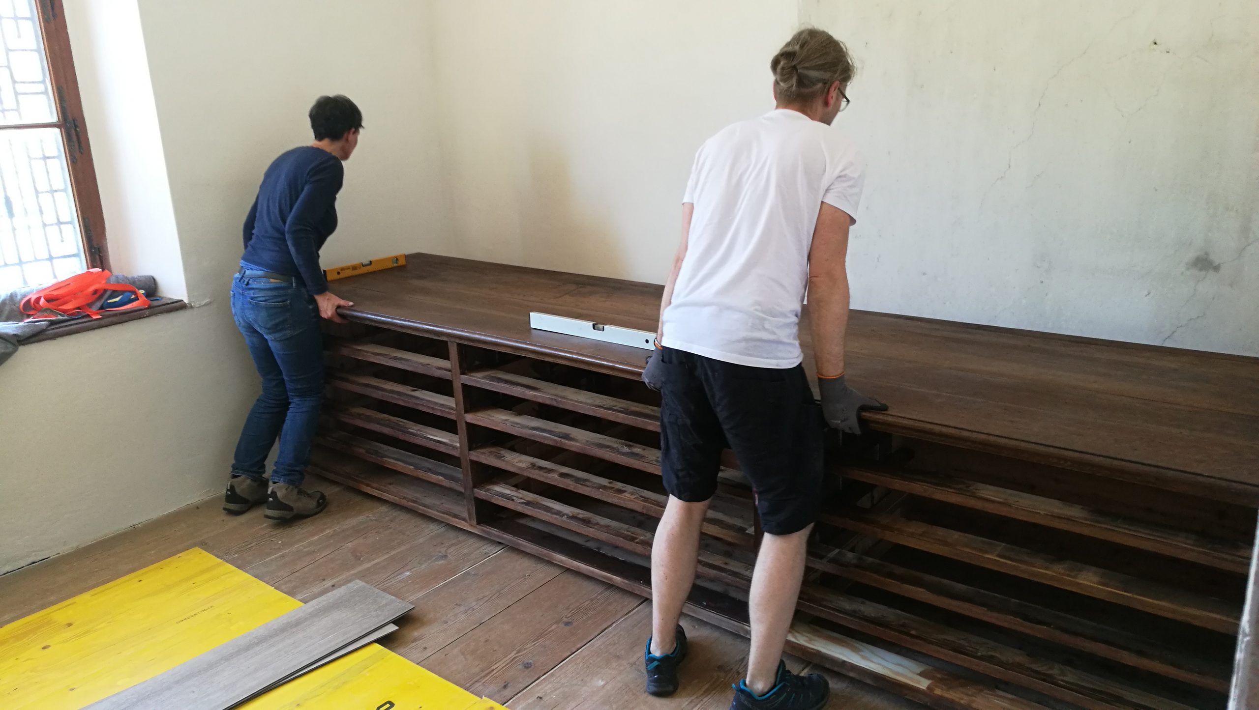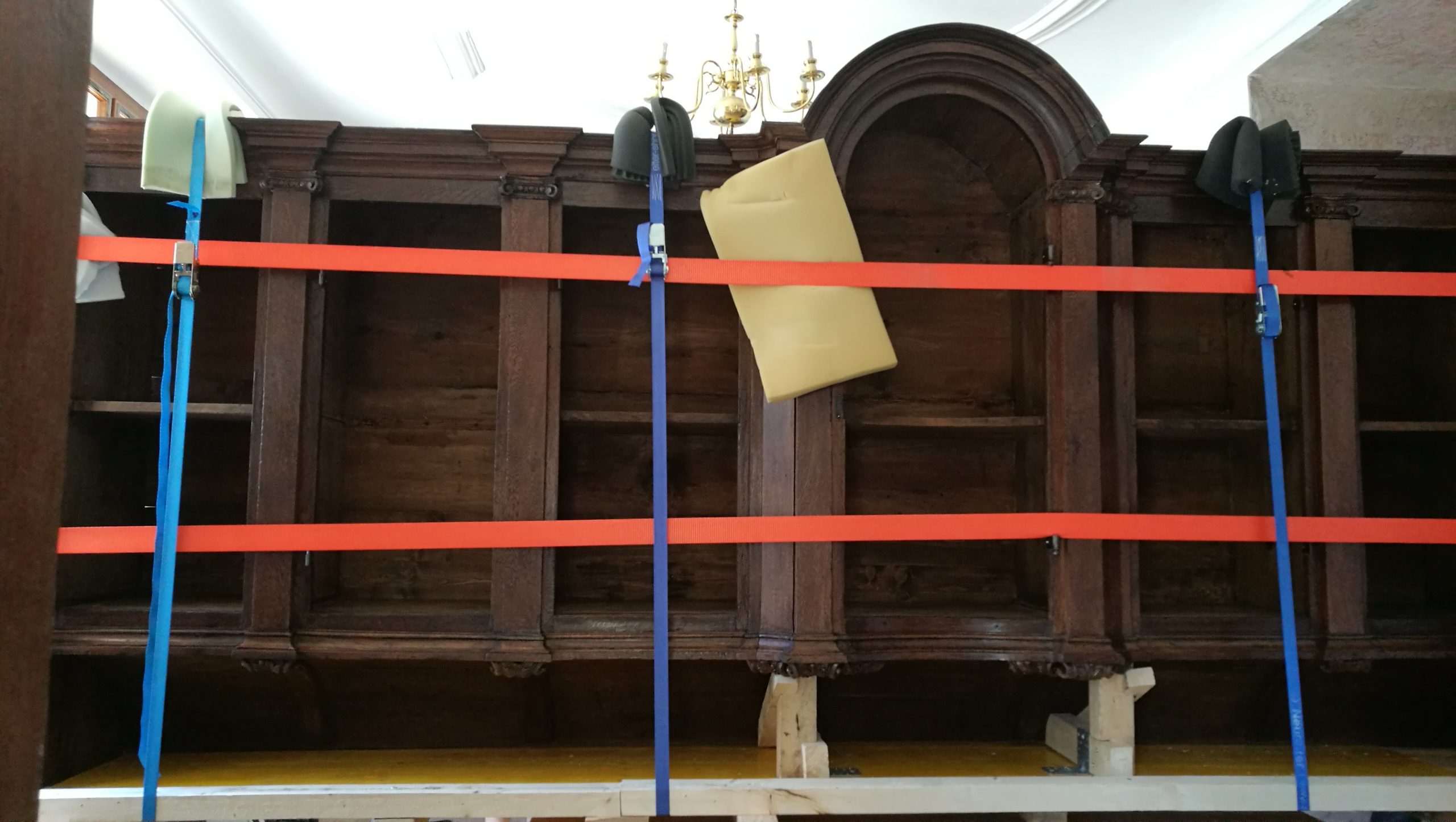 Durch intensive Zusammenarbeit aller konnte der Schrank am 11. Mai 2021 mittels Kran durchs Fenster gehoben werden und fachgerecht in seine endgültige Position gebracht werden, was wiederum nicht so einfach war, da seine Breite fast genau jener Mauerweite entspricht, in die er platziert werden sollte. In Millimeter-Arbeit gelang das Wunderwerk schließlich und so können die weiteren Arbeiten an der Schatzkammer aufgenommen werden. Wir halten Sie über deren Fortgang auf dem Laufenden!