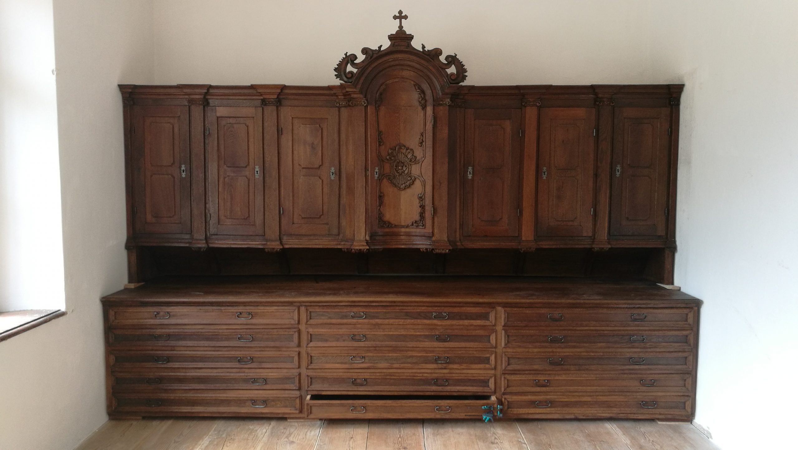 Mit der Restaurierung war jedoch der schwierigste und heikelste Teil noch nicht abgeschlossen. Der Schrank – übrigens ein Geschenk des Kirchenstifters Adam Petras aus dem Jahr 1736 – sollte auch auf den Hafnerberg heimkehren und im Obergeschoß der Schatzkammer eine neue Bleibe erhalten. Das Problem dabei war jedoch der Umstand, dass der Schrank nicht zerlegt werden konnte und in zwei großen Stücken (Unterbau und Aufsatz) von außen durch eines der beiden Fenster regelrecht gefädelt werden musste.