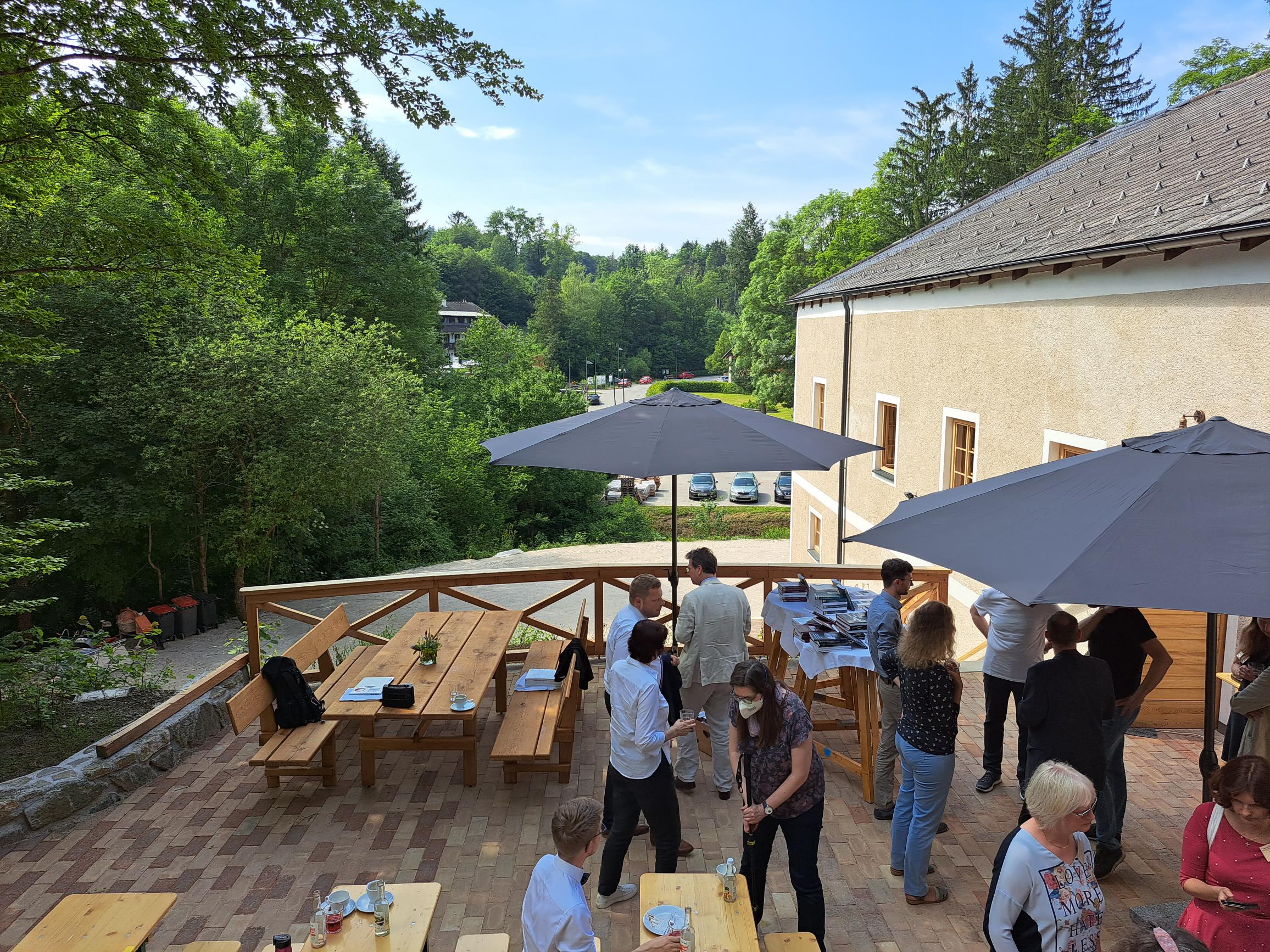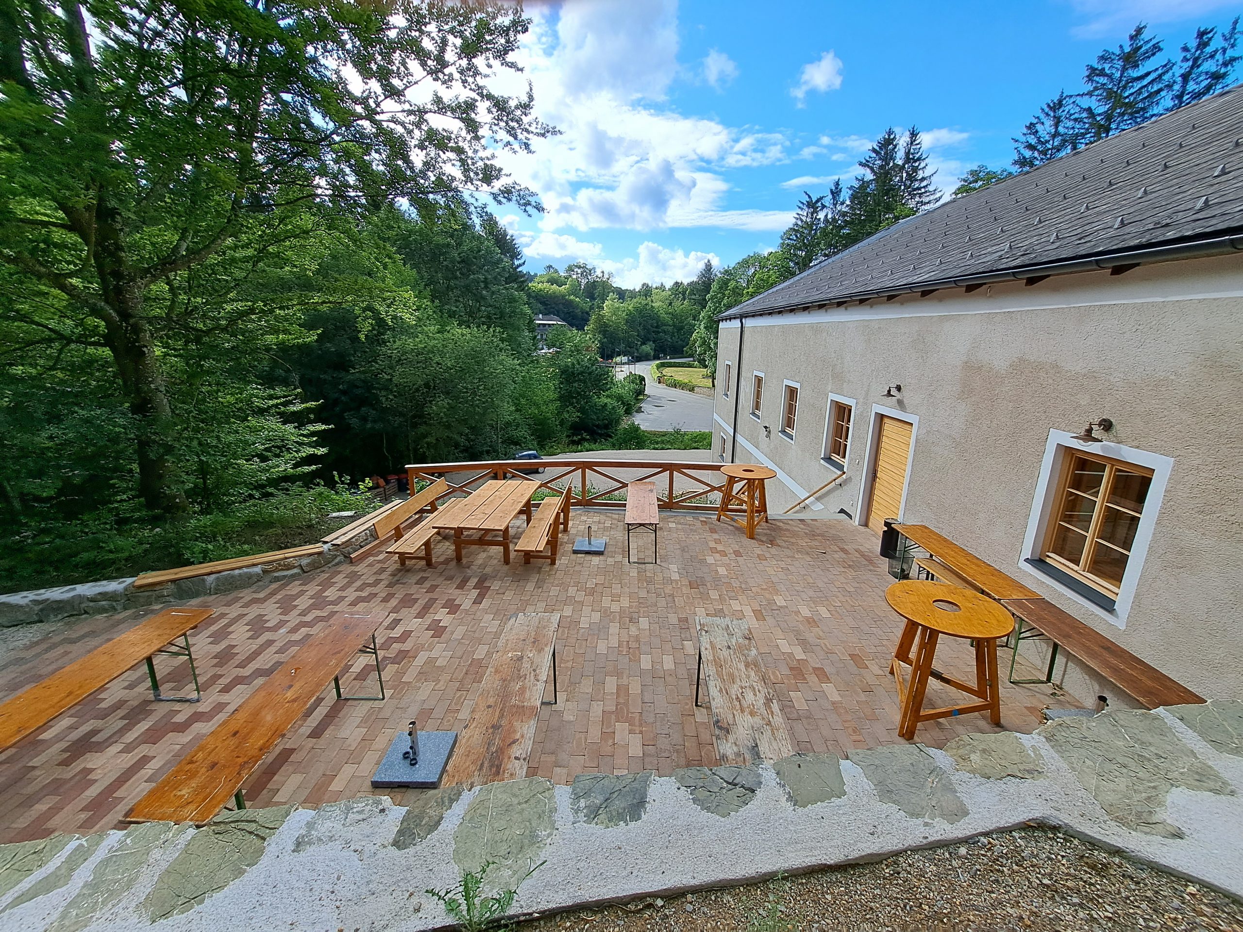 • Mobiliar: Stühle, Tische, Stehtische, kleine Bartische, Sonnenschirme, große Holzbänke und Holztisch Flipchart